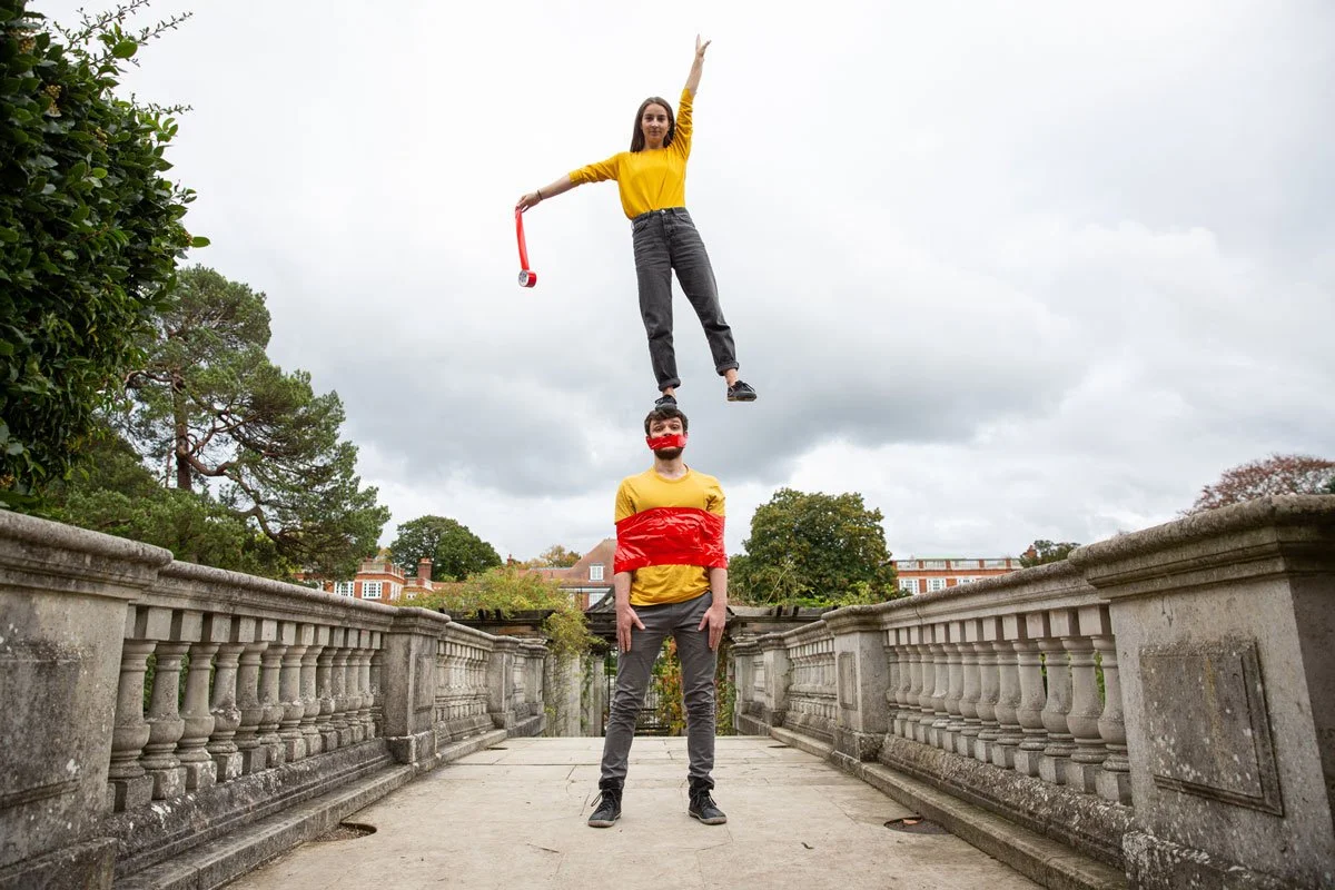 Tape That is a charming, light-hearted, non-verbal acrobatic duo. Two performers create a visual world using colourful tape, object manipulation and partner acrobatics. Using creative elements of physical theatre, a simple roll of tape transforms from DJ decks to spyglass and is stretched to create physical borders that the performers must work together to navigate.